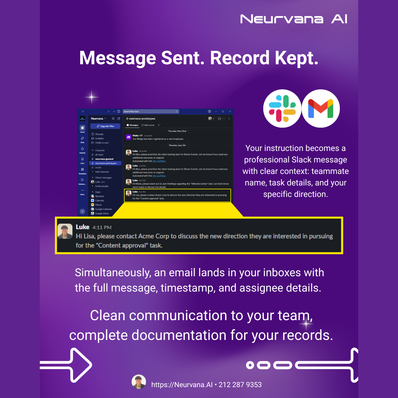 π Say what you need. The system retrieves task data from Notion, then sends your instructions to Slack with a Gmail copy for recordkeeping.